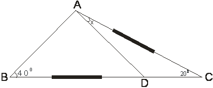 En el triángulo ABC, B=40º, C=20º, D en BC, BD=AC. Hallar <DAC.