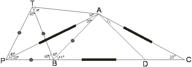Luego en BP se construye el triángulo equilátero PTB y se une los puntos T y A generando un triángulo isósceles (ABT): m< BTA = m< BAT = 50º pero m< BAP = 20º; entonces