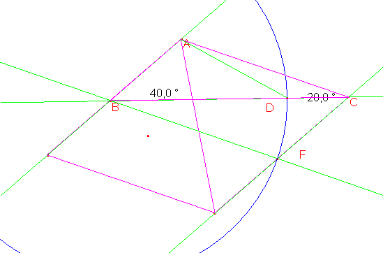 La construcción se puede realizar con Cabri construyendo un triángulo ABC de 120, 20, 40 y llevando AC paralelamente sobre B, y con radio BF y centro C construir la circunferencia que cortará a BC en D.