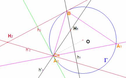 En esta proyectividad puede suceder que la perpendicular por C no corte a la circunscrita, por ser tangente a ella, en este caso el vértice A se confunde con C. Tal sucede cuando la altura por B es paralela al radio OC, la recta h2 en el dibujo. Le corresponde en C*