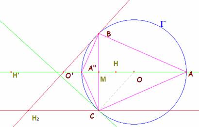 Por tanto, H y H’ (simétricos respecto a BC de A” y A respectivamente) son los ortocentros de los triángulos ABC y A”BC. Si HH’ es un eje de la cónica, el punto medio O’ es su centro, equidistante de B y C por estar en su mediatriz.