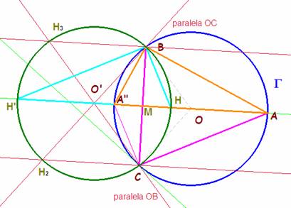 Los puntos H’ y H por simetría respecto a BC se transforman en A y A”: son congruentes los triángulos H’HB y AA”B. Resulta que BO’= CO’=BO=O’H =O’H’. Se trata de una circunferencia de igual radio que G. Sus centros son simétricos respecto del lado fijo BC (pues M es también punto medio de AH’)