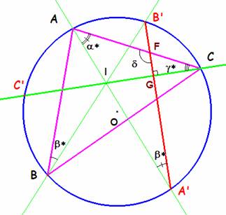 Queremos probar que la bisectriz de C es perpendicular a A’B’ y en consecuencia, el ortocentro de A’B’C’ es el incentro I de ABC. Denotamos por a*, b* y g* los ángulos mitad de A, B y C respectivamente. Observando el triángulo AA’F (donde F es la intersección de A’B’ con AC) el ángulo en A’ mide b* por abarcar el arco AB’ y el ángulo en F, d mide 90 + g* por ello el ángulo FGC es recto como se pretendía demostrar.