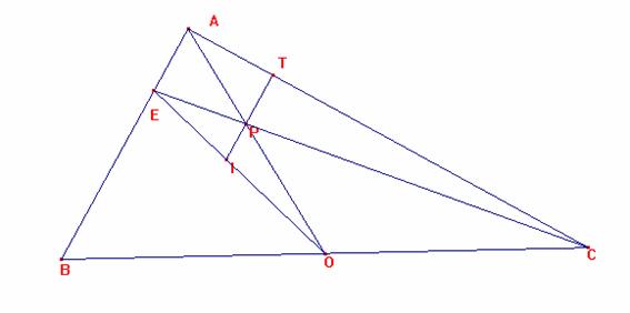 2.- Supongamos ahora que en un triángulo rectángulo ABC con c<b<a, OI corta a AB en E y que CE, IT y AO, tienen un punto común.