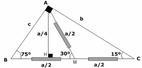 Se traza la altura AH (relativo a la hipotenusa), luego se traza la mediana AM (relativo a la hipotenusa), se sabe que en un triángulo rectángulo la mediana relativa a la hipotenusa mide la mitad de dicha hipotenusa. O sea (BC = MC = AM = a/2); entonces si BC mide “a”; por lo tanto la mediana medirá “a/2”; además el triángulo AMC es isósceles (AM = MC, m< MAC = m< MCA = 15º) entonces la medida del ángulo AMB será 30º.