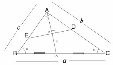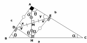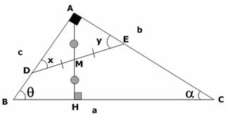 4. Sea M el punto medio de la altura por A. Se traza por M una recta DE cuyo punto medio es M, y está limitada por los catetos. Se pide el valor de los ángulos en E y D en función de los del triángulo.