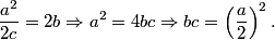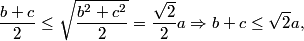 Según la hipótesis es Por otro lado, usando la desigualdad entre las medias aritmética y cuadrática, cumpliéndose la iugaldad si y solo si b y c son iguales. Por tanto, en nuestro caso tendremos que b=c=45º. |