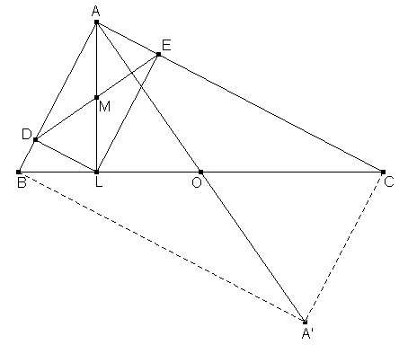 | Si llamamos A' al simétrico de A respecto de O, obtendremos el rectángulo ABA'C semejante a AELD. Como los lados homólogos, por ejemplo AB y AE, de estos triángulos son perpendiculares, también lo serán sus diagonales, por ejemplo, DE y AA', por lo que la perpendicular a DE por A pasa por O y la distancia pedida es cero. |