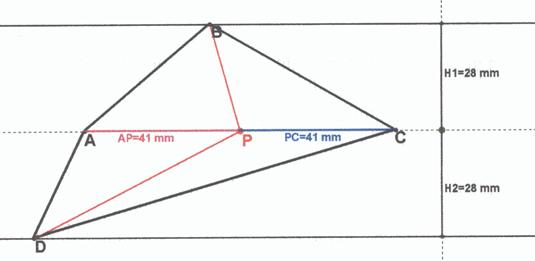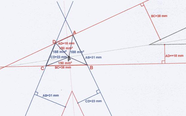 Uno se puede imaginar fácilmente dos triángulos con una base común (el segmento AC) y dos vértices el B y el D situados a distinto lado de la base y con la misma altura, o sea ABC equivalente a ACD. Si estos dos triángulos se dividen por las medianas correspondientes a la base común se habrá conseguido cuatro triángulos equivalentes cuya suma forman un cuadrilátero. Luego un cuadrilátero cuya diagonal lo divida en dos triángulos equivalentes, cumple la propiedad de tener un punto P tal que se pueda unir con los vértices y delimite cuatro triángulos equivalentes.