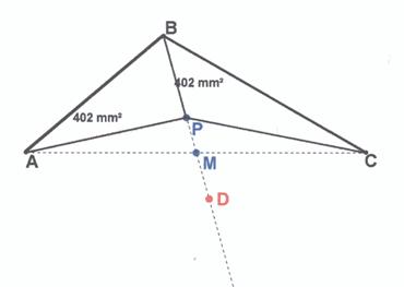Fijado un punto P de la mediana BM Se puede repetir el proceso con el triángulo APC, y, se deduce que la recta donde podrá estar el punto D para que se pueda unir con los vértices y delimite triángulos equivalentes es la mediana PM que está sobre la recta BM. Es más, el vértice que falta D será el simétrico del vértice B respecto del punto P para que los cuatro triángulos que comparten el vértice P sean equivalentes. Luego el punto P está en una diagonal.