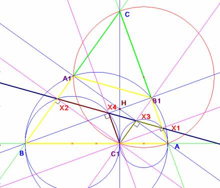 De otra parte, X1X2X3 es la recta de Simson-Wallace del punto C1 para el triángulo rectángulo A1AC y por tanto X4 está sobre ella.