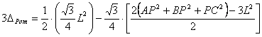 De forma análoga podemos expresar el área del triángulo de Pompeiu tomando otros dos lados del mismo y el ángulo comprendido, de forma que tenemos las siguientes tres expresiones para el área