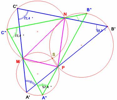 Los triángulos A’B’C’ y A*B*C* son semejantes. En la figura observamos que las circunferencias que contienen los arcos capaces utilizados en la construcción de A*B*C* se cortan en un punto S. Éste es el centro de semejanza. Veámoslo.