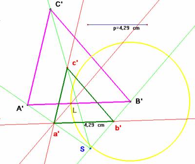 Se toma una circunferencia con centro en B’ y radio B'L igual a la longitud del segmento p. Se une S con los vértices del triángulo y se traza por L una paralela a B’S que corta a A’S en el punto a’. El resto es fácil de ver en el dibujo.