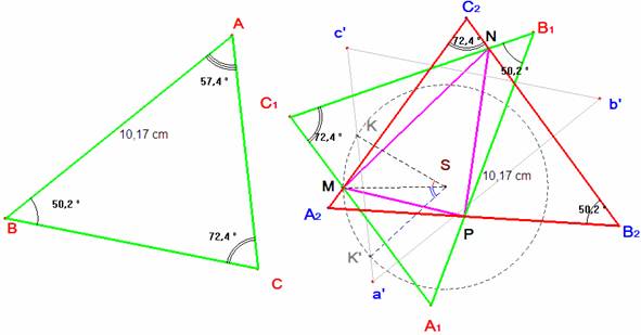 Trazamos con centro S una circunferencia que pasa por M. Intercepta en el lado a’c’ dos puntos K y K’. Un giro con centro S que transforme el punto K en M nos da el triángulo A1B1C1. Si el giro pasa de K’ a M se obtiene el triángulo A2B2C2.