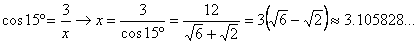 Es bien conocido (véase, por ejemplo, Equilateral triangle, Wolfram Mathworld) que el triángulo equilátero de mayor área que se puede inscribir en un cuadrado es aquel que tiene uno de sus vértices coincidente con uno de los vértices del cuadrado y los otros dos en los puntos de corte de las semirrectas que parten de este vértice común con los otros lados y formando 15º con cada lado contiguo. La demostración es sencilla y consiste en probar (utilizando el teorema de Pitágoras junto con trigonometría elemental) que el tercer lado del triángulo así construido, mide igual que los otros dos lados. Un sencillo cálculo trigonométrico proporciona: