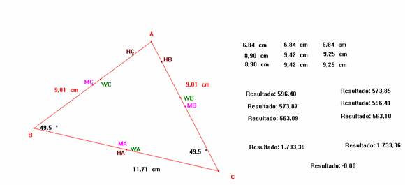 y como sabemos, por propiedades de los determinante si dos filas o dos columnas de un determinante son idénticos el determinante es nulo, cada vez que tengamos un triángulo isósceles (sin necesidad de que sea equilátero) tendremos que el determinante formado por las alturas, medianas y bisectrices será nulo.