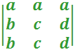 Cada vez que tenemos un triángulo isósceles, la altura, la bisectriz y la mediana (calculada desde el vértice opuesto a la base) pasan por el punto medio de la base, es decir, determinan el mismo segmento, por ende tienen la misma longitud, y al sustituir dichos valores en el determinante planteado tenemos una fila igual, además, la altura, la bisectriz y la mediana calculada desde un vértices de la base tienen la misma longitud si consideramos el otro vértice de la base, obtenemos un determinante de la forma: