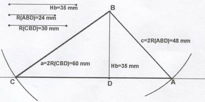 Con los tres datos de un triángulo de vértices CBD (lado CB, ángulo D opuesto al lado BC, y el radio de la circunferencia circunscrita) se pueden conseguir tres parejas de datos equivalentes o sea con dos de estos datos se puede obtener el tercero. En este caso particular se conoce el ángulo D, que es recto por ser el pie de la altura Hb, y, el radio R(CBD) de la circunferencia circunscrita al triángulo CBD luego se podrá deducir el lado BC. La deducción del lado BC es inmediata porque la hipotenusa de un triángulo rectángulo inscrito en una circunferencia es el diámetro de la misma por ser el arco capaz de 90º del segmento BC. En conclusión el diámetro de la circunferencia circunscrita al triángulo CBD es el lado BC.