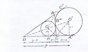 Los datos del problema permiten, pues, construir el ángulo B, la circunferencia O’ inscrita en él, de radio dado, r’, y la exinscrita O’’ tangente en A’’ y C’’ a sus lados. Con lo cual quedará determinado el lado AC del triángulo, que será tangente común a ambas circunferencias.