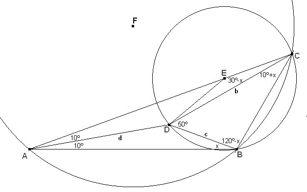 Para construir la figura tenemos en cuenta que la recta AD es la bisectriz del ángulo A del triángulo ABC, por lo que, fijados los vértices B y C, basta trazar los arcos capaces del segmento BC para los ángulos 20º y 50º, con centros F y E, respectivamente. Entonces, el vértice A estará sobre el primero de estos arcos, y sobre la semirrecta que parte de B y forma un ángulo de 120º con BC. La bisectriz de este ángulo A encuentra al arco capaz de 50º en el punto D. Observamos que ÐECB = 40º, ya que EBC es isósceles y ÐBEC = 100º. También es ÐACB = 180º-120º-20º = 40º. Por tanto, A, E y C están alineados. |