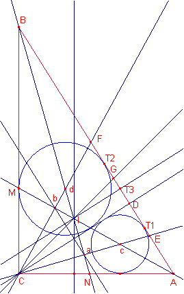 En el triángulo rectángulo ABC (con el ángulo recto en C), se traza CD perpendicular a AB, y también CE, CF, BM y AN, bisectrices de los ángulos ACD, BCD, ABC y CAB respectivamente.