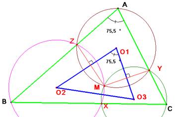 enunciado tomamos la definición del punto de Miquel. Si M está en las circunferencias que pasan por B y C, el ángulo <XMZ = 180 –B y < XMY =180 – C por tanto < ZMY =180 – A, que prueba
