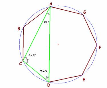Problema 493 .- Hallar el área del único triangulo escaleno (módulo rotaciones) formado desde los tres vértices de un heptágono regular, teniendo los ángulos p/7, 2p/7, y 4p/7, respectivamente, inscrito en una circunferencia de radio R.