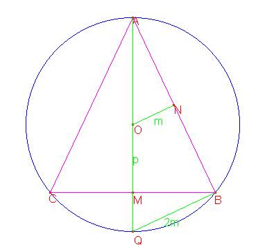 Una vez conocido R se construye fácilmente el triángulo pedido. Se traza una circunferencia con este radio (ver figura superior del todo). En un diámetro AQ a la distancia OM = p se traza una perpendicular que determina los otros dos vértices B y C