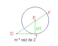 Si DT = m * raíz de 2 , trazando una perpendicular en T tomamos un punto E a la distancia p/2, como centro de una circunferencia de radio p/2.