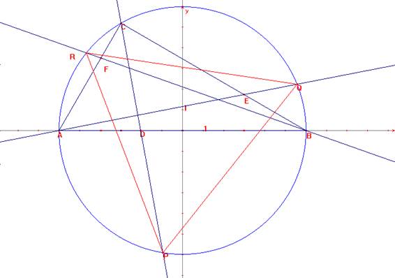 En un triángulo rectángulo ABC con <A=60º y B=30º, sean D,E,F los puntos de trisección cercanos a A, B y C sobre los lados AB, BC y CA, respectivamente. Extendemos CD, AE y BF hasta intersecar a la circunferencia circunscrita en P, Q y R. Demostrar que PQR es un triángulo equilátero.