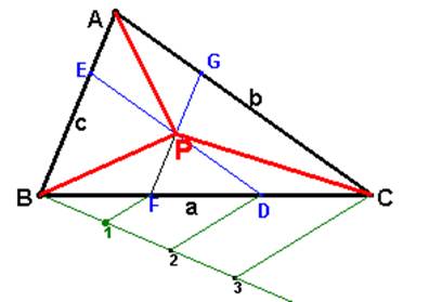 265.- Encontrar en el interior de un triángulo dado un punto tal que los segmentos que lo unen a los vértices del triángulo dividen al inicial en tres triángulos cuyas áreas sean iguales.
