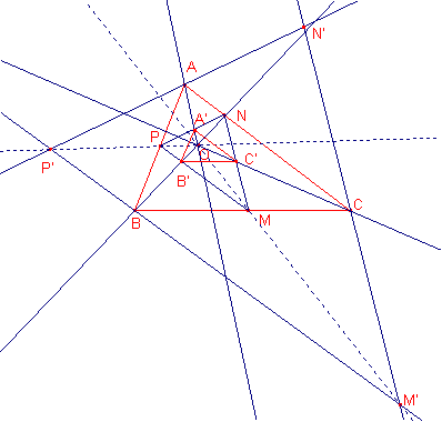 tal que los lados homólogos sean paralelos, es decir, A' en NP, B' en PM, C' en MN, A'B' paralelo a AB, B'C' paralelo a BC, y C'A' paralelo a CA.