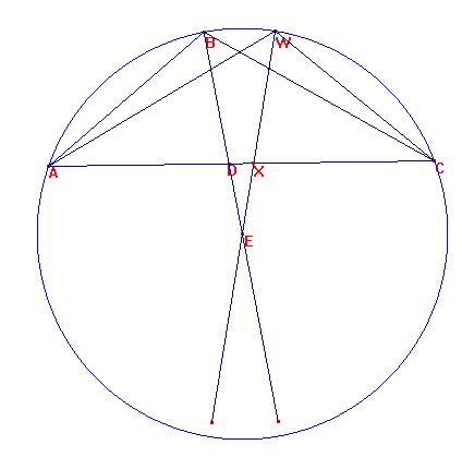 De igual manera, <XWB=<XWA+<AWB=5β+<ACB=5β+3β, por lo que el triángulo EBW es isósceles y <BWE=180º-16β.