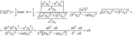 Podemos, pues, determinar el área del triangulo OQP calculando la altura del mismo (distancia del origen a la recta tangente t) y la base, es decir el modulo del vector QP. De esta forma, tenemos que, después de simplificar