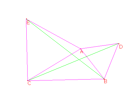 D -> B, C->E, el triángulo AEC es también equilátero, BE=CD… y <ECB=90..