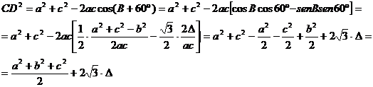 y aplicando el teorema de los cosenos al triangulo ABC, tenemos que