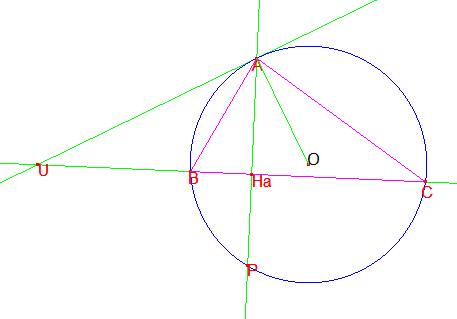 Sea, sin pérdida de generalidad, B>C. Es <BAO=90-C, <UAB=C, y por último, <BUA=B-C.