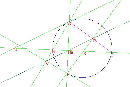 (v)La altura AHa de un triángulo ABC interseca a la circunferencia circunscrita a ABC en P. La recta de Simson de P respecto a ABC es paralela a la recta tangente por A a la circunferencia circunscrita.