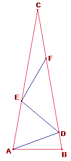 1.- Hallar el ángulo ACB (su valor numérico) sabiendo que (ABC) isósceles con AC = BC y que los segmentos AB, AD, DE, EF, FC son iguales. con D, y F sobre BC, con el orden CFDB, y E sobre CA, con E interior.