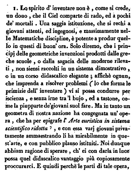 El espíritu del descubrimiento no es, como se cree, un regalo que el cielo comparte en raras ocasiones y a pocos mortales. Una sabia institución, dedicada a jóvenes atentos e ingeniosos en la disciplina matemática, es capaz de hacer que los produzcan a menudo. Solo diremos que los principios de los descubrimientos geométricos realizados en las escuelas griegas, o gracias a la inteligencia de las modernas, no se hallan recogidos en un sistema demostrativo, o en un elegantecurso didascálico para que todo aquel que pretenda resolver problemas (lo que es el principio del descubrimiento) pueda ser guiado por la ciencia, sin quedarse a oscuras y a tientas, como le suele suceder a la mayor parte de los jóvenes. No obstante, un geómetra de nuestra nación ha compuesto una obra titulada Arte heurística adaptada al sistema científico, y con ella ha instruido admirablemente en privado a varios jóvenes en este arte, los cuales han sido reconocidos públicamente. Por tanto, tenemos razones para pensar que su publicación pueda procurarnos esa didascálica ventaja.