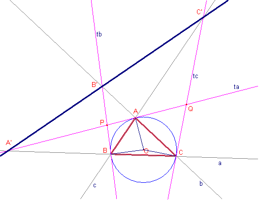 Sean A', B' y C' las intersecciones de las rectas a, ta ; b , tb y c, tc.
