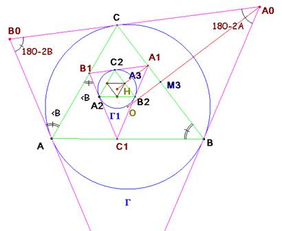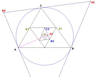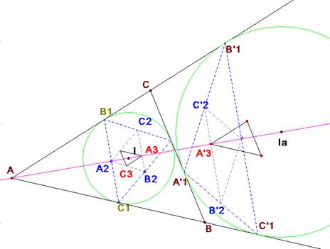 pues estos segmentos son paralelos. El punto de encuentro con éste último es el vértice A3. Por tanto A y A3 están alineados con I. Los triángulos son homotéticos.