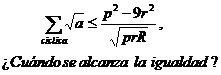 Dado el triángulo ABC, en el que a, b, c son los lados y p, r, R son el semiperímetro, el radio del círculo inscrito, y el radio del círculo circunscrito al triángulo, entonces se verifica:
