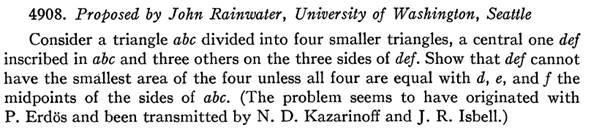 Consideremos un triángulo abc dividido en cuatro triángulos más pequeños, uno central def y otros tres sobre los tres lados de def. Mostrar que def no puede tener la menor área de los cuatro solamente cuando todos son iguales y d, e y f son los puntos medios de abc. (El problema parece ser original de P. Etrdös y ha sido transmitido por N. D. Kazarinoff y J. R. Isbell.)