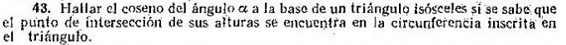 43. Hallar el coseno del ángulo α a la base de un triángulo isósceles si se sabe que el punto de intersección de sus alturas se encuentra en la circunferencia inscrita en el triángulo