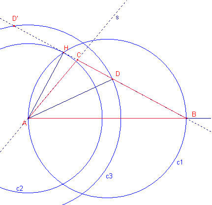 g) La circunferencia c3 corta la recta BH en los puntos D, D’.