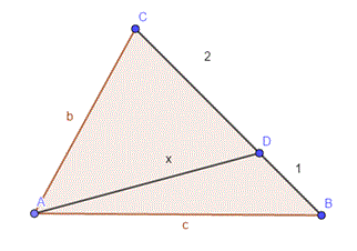 el punto D divide el lado BC en dos partes de longitudes BD=1, DC=2, y se conocen los ángulos