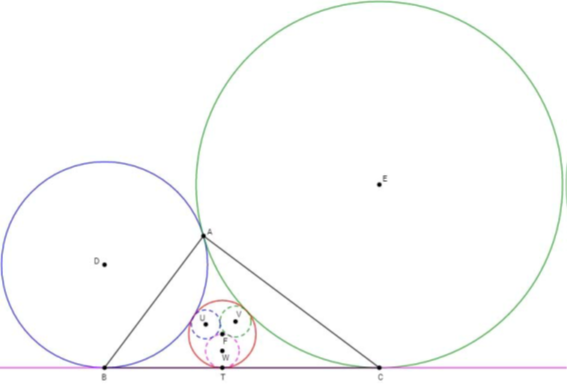 B) Dado un triángulo ABC tal que las circunferencias (D) y (E) que pasan por el punto A y son tangentesa la recta BC en los puntos B y C, respectivamente, son tangentes en el punto A, se considera lacircunferencia (F) inscrita en el triángulo mixtilíneo formado por ambas circunferencias y la recta BC.La inversión con respecto a la circunferencia (F)transforma la circunferencia (D) en la circunferencia(U), la circunferencia (E) en la circunferencia (V) y la recta BC en la circunferencia (W). Calcular, enfunción de las longitudes y los radios de las circunferencias (U), (V) y (W)