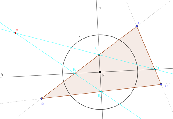 Sea ABC un triángulo, P un punto del plano y c una circunferencia con centro en P. Se consideran r1 , r2 diámetros perpendiculares de c, los puntos A1,A2 intersecciones respectivas de tales diámetros con los lados (o sus prolongaciones) que parten del vértice A y los puntos B1,B2 intersecciones respectivas de tales diámetros con los lados (o sus prolongaciones) que parten del vértice B.
